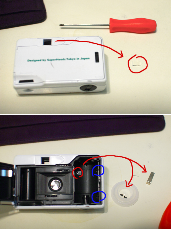 #01 上圖:喬喬的相機的景觀窗掉 了一小片鏡片,所以拍 照時完全看不到景物 #02 下圖:上網找了資料,等喬喬 睡著後開始拆解修理, 紅色圈圈為順利取下的 ,藍色圈圈的螺絲因為 起子太大無法卸下@@ |